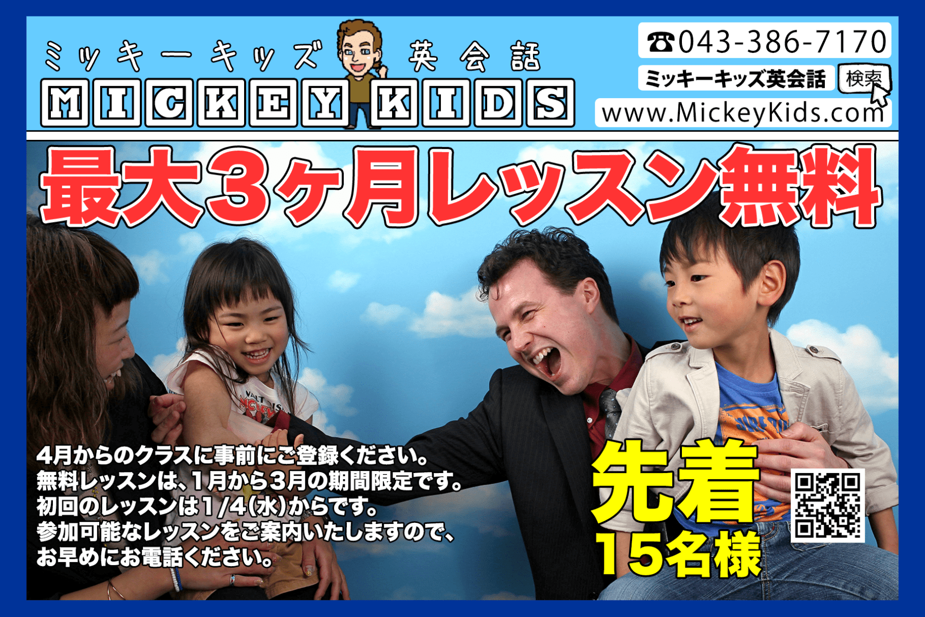 4月からのクラスに事前にご登録ください。 無料レッスンは、1月から3月の期間限定です。 初回のレッスンは1/4(水)からです。 参加可能なレッスンをご案内いたしますので、 お早めにお電話ください。