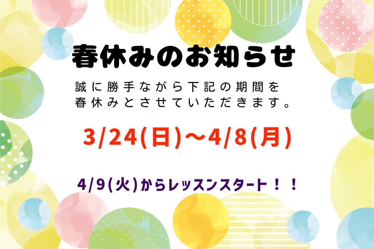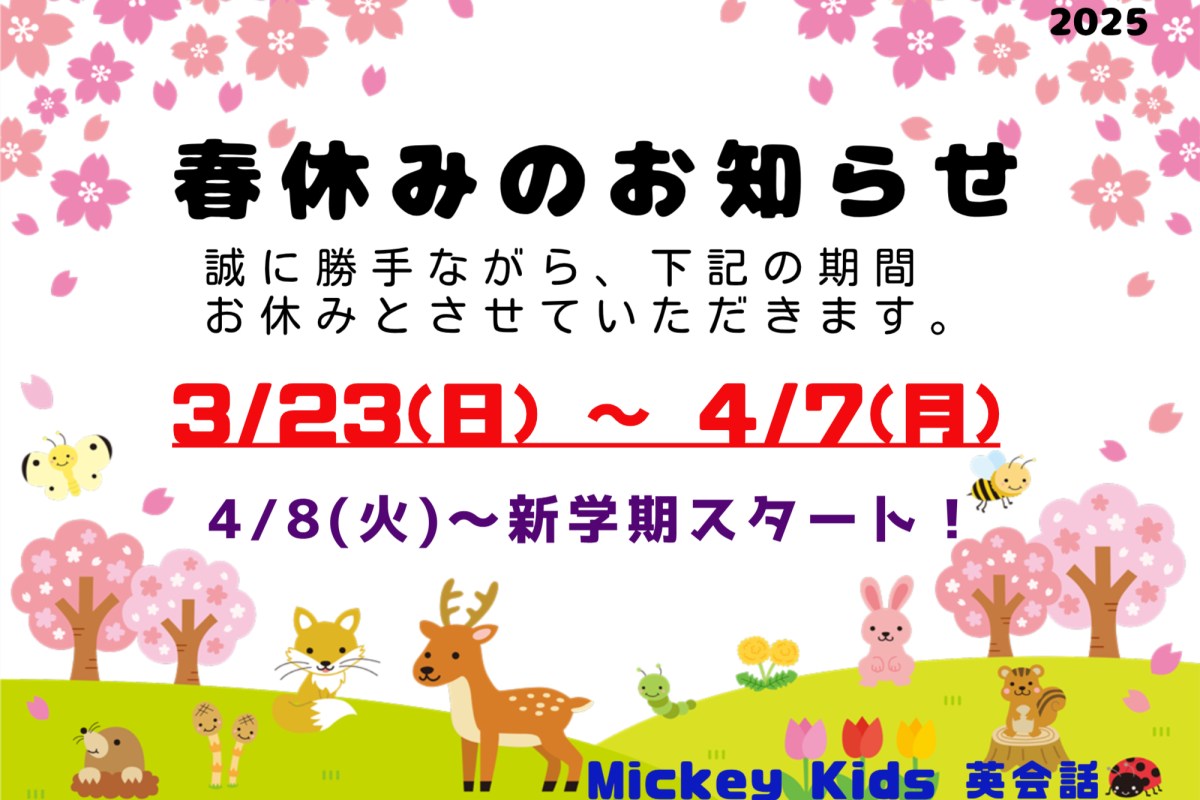 春休みのお知らせです。 3/23(日)~4/7(月)はレッスンがお休みとなります。 何卒よろしくお願い申し上げます。 また、新学期は4/8(火)よりスタートします! 体験レッスンも随時受け付けております☆ #Mickey Kids英会話 #ミッキーキッズ英会話 #千葉市 #千葉市中央区 #子供英会話 #幼児 #小学生 #千葉駅 #千葉中央駅 #ネイティブ講師