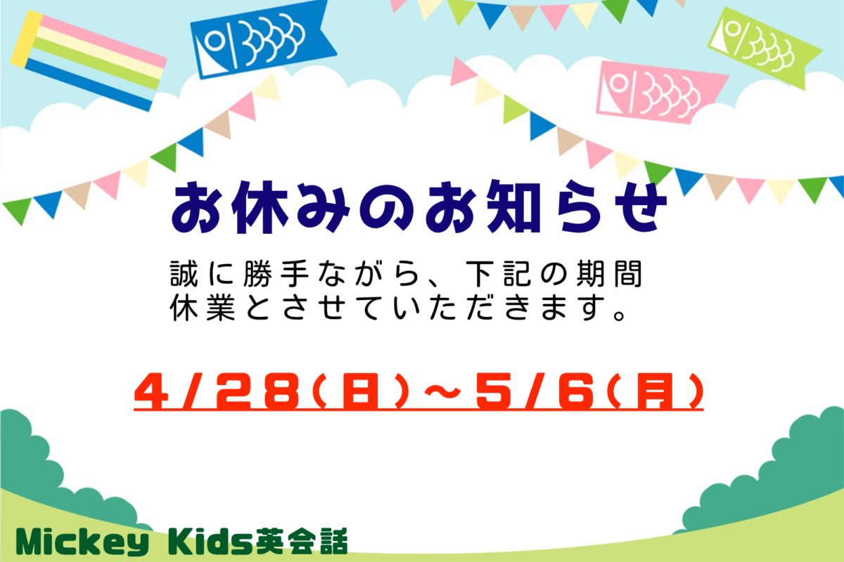 4/9より新学期のレッスン開始しております☆ また、体験レッスンも新学期初日からさっそくお越しいただき ありがとうございました! 来週もお待ちしております♪ さっそくではありますが・・・ ゴールデンウィーク期間のお休みのご案内です。 4/28(日)~5/6(月)までお休みをいただきます。 よろしくお願い致します。 #Mickey Kids英会話 #ミッキーキッズ英会話 #千葉市 #千葉市中央区 #子供英会話教室 #幼児 #小学生 #ネイティブ講師 #千葉駅 #千葉中央駅