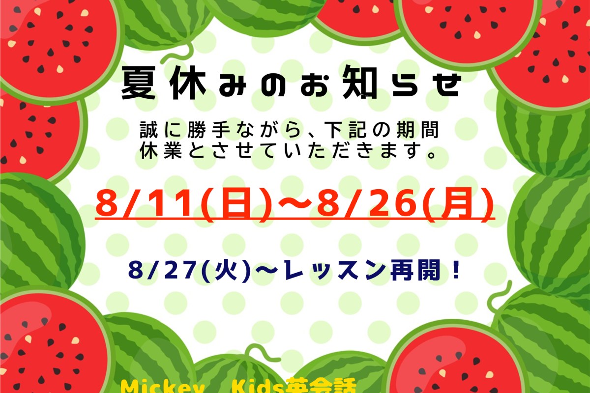 毎日毎日とっても暑いですね! みなさんしっかり食べて、水分補給をしてくださいね! ミッキーキッズ英会話は、8/11(日)~8/26(月)まで 夏休みのためレッスンがお休みです。 8/27(火)からレッスン再開致します。 みなさん、体調にお気を付けながら 楽しい夏休みをお過ごしください☆ #Mickey Kids英会話 #ミッキーキッズ英会話 #子供英会話教室 #千葉市 #千葉市中央区 #千葉駅 #千葉中央駅 #幼児英会話 #小学生 #英会話 #ネイティブ講師