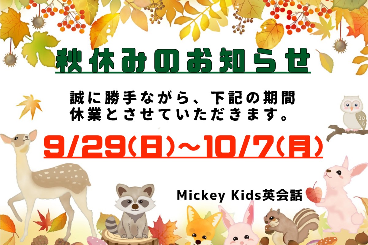 まだまだ暑い日が続いていますね・・・(+_+) 秋休みのお知らせです。 下記期間はレッスンがお休みとなります。 9/29(日)~10/7(月) よろしくお願いいたします! また、10月後半は毎年恒例のハロウィンパーティーを予定しております。 お友達を連れてのご参加、大歓迎です☆ 後日詳細などお知らせいたします。 #Mickey Kids英会話 #ミッキーキッズ英会話 #子供英会話 #幼児 #小学生 #千葉市 #千葉中央 #ネイティブ講師