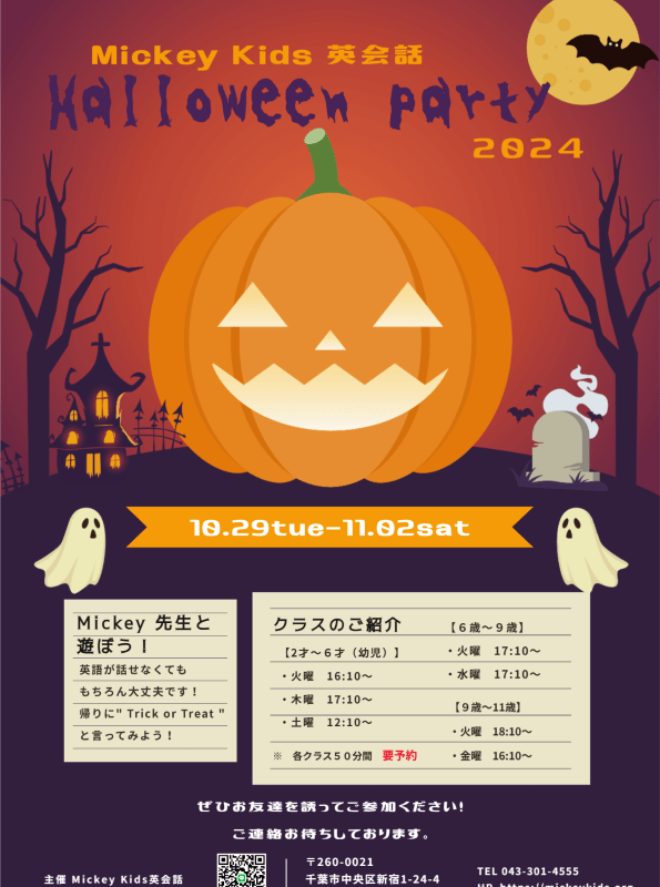 ハロウィンパーティーのお知らせです! 今年もお友達を連れてぜひご参加ください♪ 仮装でのご参加大歓迎です☆ ご参加をご希望の方は教室までご連絡ください。 ご年齢を目安にしたクラスの時間割は下記の通りです。 ☆各クラス/50分間レッスン 【2歳~6歳(幼児)】 ・火曜 16:10~ ・木曜 17:10~ ・土曜 12:10~ 【6歳~9歳(小学生)】 ・火曜 17:10~ ・水曜 17:10~ 【9歳~11歳(小学生)】 ・火曜 18:10~ ・金曜 16:10~ お待ちしております! #ミッキーキッズ英会話 #Mickey Kids英会話 #子供英会話 #幼児英会話 #小学生 #ネイティブ講師 #ハロウィン #千葉市 #千葉中央 #千葉駅