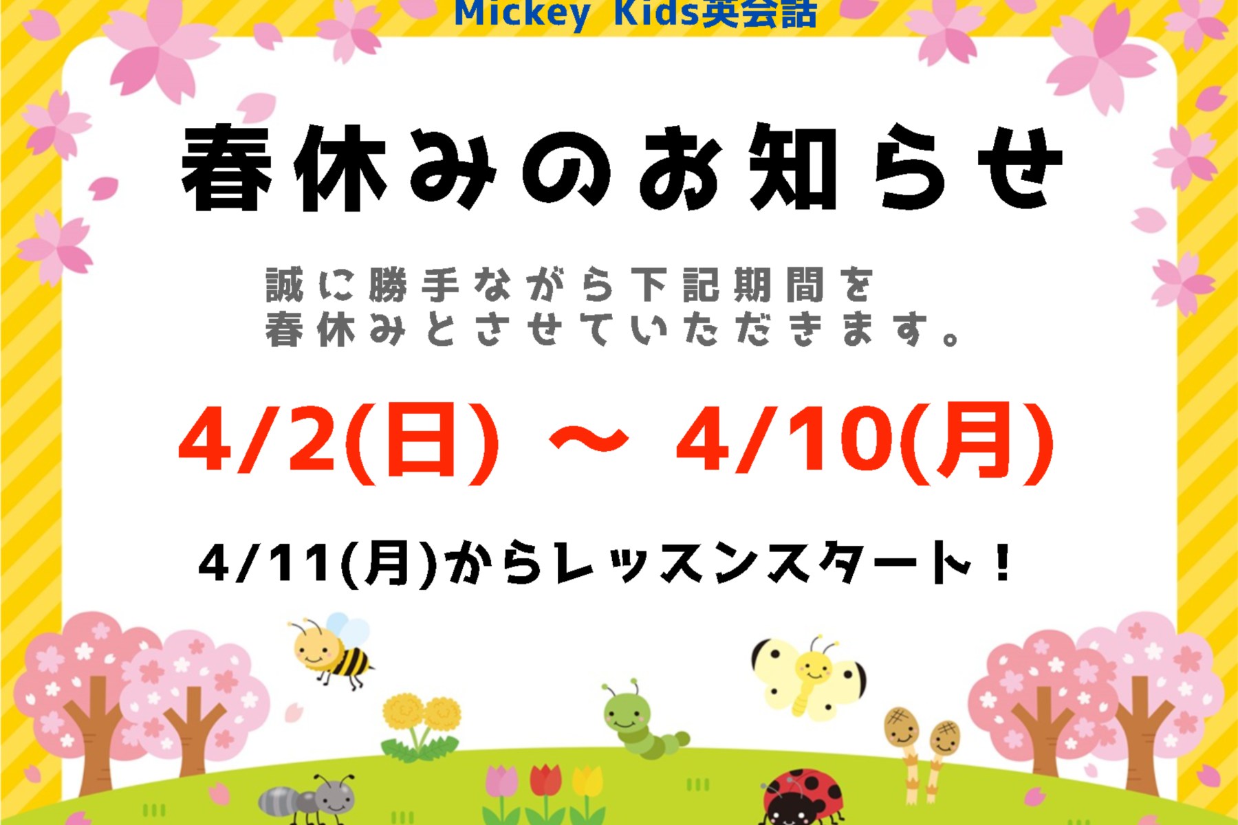 4/2(日)~4/10(月)は春休みとなります。
