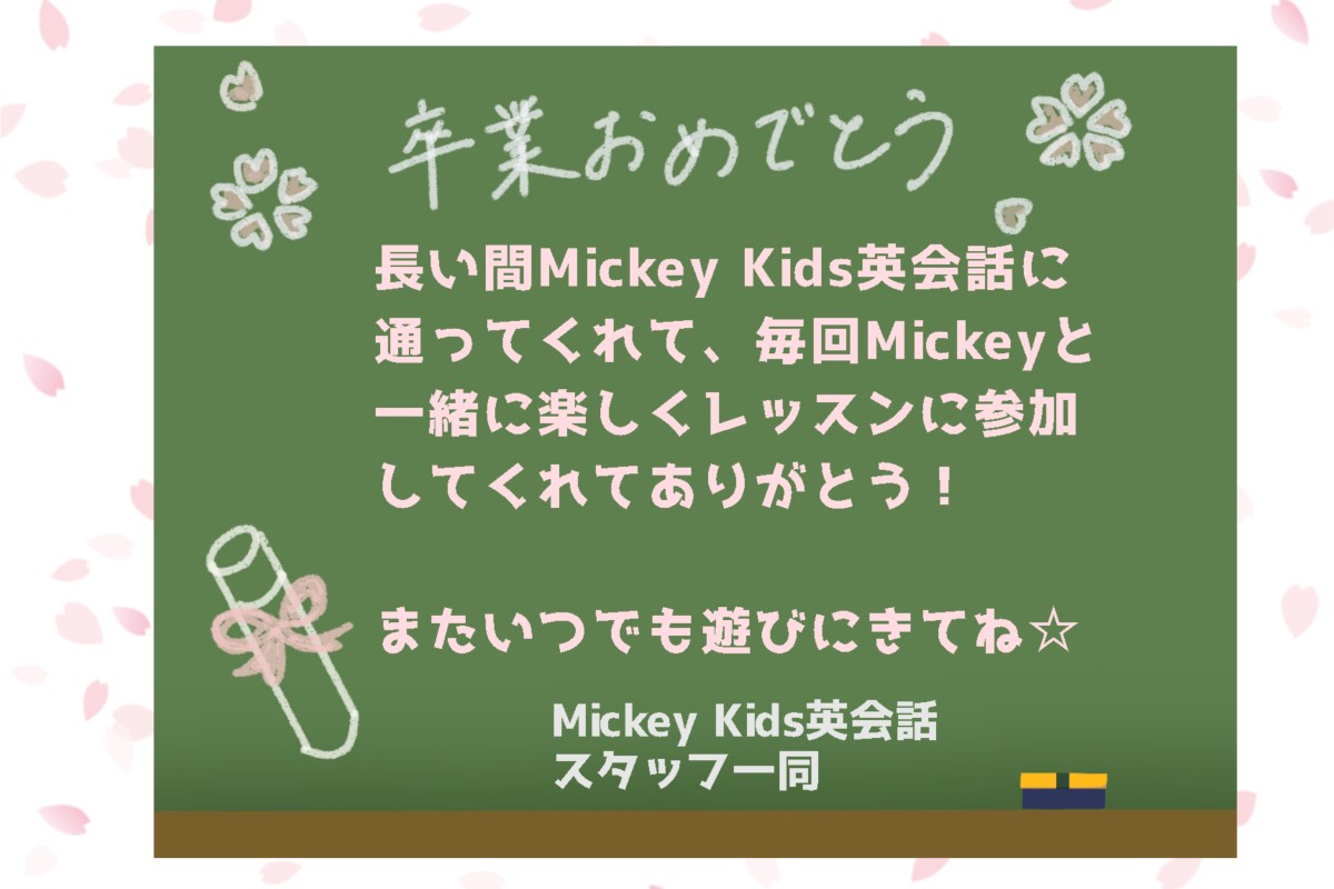 今週はショータイム、来週はテストとなります。 今年度最後のテストです! 再来週はパーティー! 今年度お疲れ様パーティーです♪ 今週、近隣の小学校では卒業式が行われているそうです。 3月はミッキーキッズでも教室を卒業する生徒がいます。 今年で10周年となるミッキーキッズですが、 初期からいる生徒さんの小学校卒業や中学卒業を 見届けることが多くなってきました。 こんなにも長く通ってくださり、いつもミッキーと一緒に 楽しくレッスンを受けて下さり、 なによりも英会話の力だけではなく、 心などの成長がドンドン伸びていく姿を見る事が出来て 本当に嬉しく思います! ありがとうございます。 そして・・・ご卒業おめでとうございます!! またいつでもミッキーキッズに遊びに来てくださいね☆ ミッキーキッズでは、幼児から通われて中学や高校に入るまで 長く通われている方がたくさんいらっしゃいます♪ 体験レッスンも受け付けておりますので ぜひ、一度ミッキー先生の楽しいレッスンを受けてみませんか? さらに、いまなら『春のご入会キャンペーン』実施中です☆ 【Mickey Kids英会話教室】 LINE ID : mickeykidschiba TEL :043-301-4555 住所:千葉県千葉市中央区新宿1丁目24-4 藤田マンション201号室 定休日:日曜、月曜、(その他夏季冬季など休みあり) 最寄駅:千葉中央駅 徒歩8分、市役所前駅 徒歩8分、JR千葉駅 徒歩15分 #ミッキーキッズ英会話 #Mickey Kids英会話 #英会話 #子供英会話教室 #千葉市 …